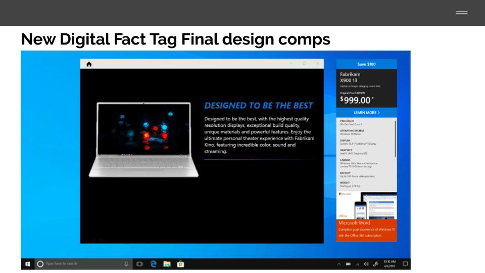 Based on the various feedback, several options were developed for the DFT. A mini fact tag that showed the least information vs a full accordion that would show all the specs. Ultimately I landed on designing to meet dual needs of being simple and easy to understand for the end user and also for the retailer to reskin the DFT to make it on brand in an easy manner. The final product, after may a/b tests, is capable of both.