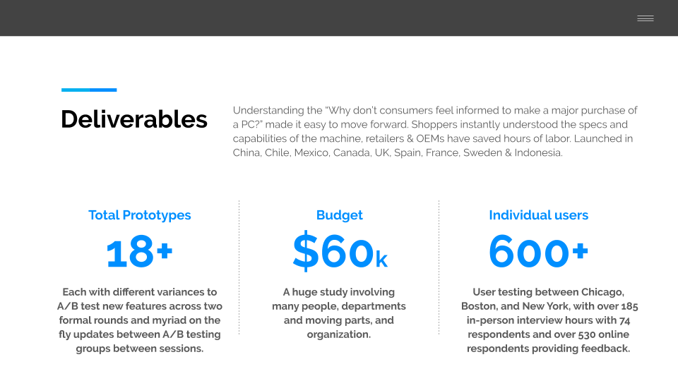 I knew it was complete when both customers and retailers weren't asking "What does this do?" and instead were letting me know that having the information displayed that would inform decisions was the right approach and made it easy to both purchase and sell the pc.