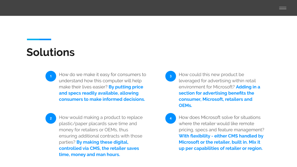 Many questions surrounded this project and it was very rewarding to solve for questions like: How do we make it easy for consumers to understand how this computer will help make their lives easier? How would making a product to replace plastic/paper placards save time and money for retailers or OEMs, thus ensuring additional contracts with those parties? How could this new product be leveraged for advertising within retail environment for Microsoft? How does Microsoft solve for situations where the retailer would like remote pricing, specs and feature management?