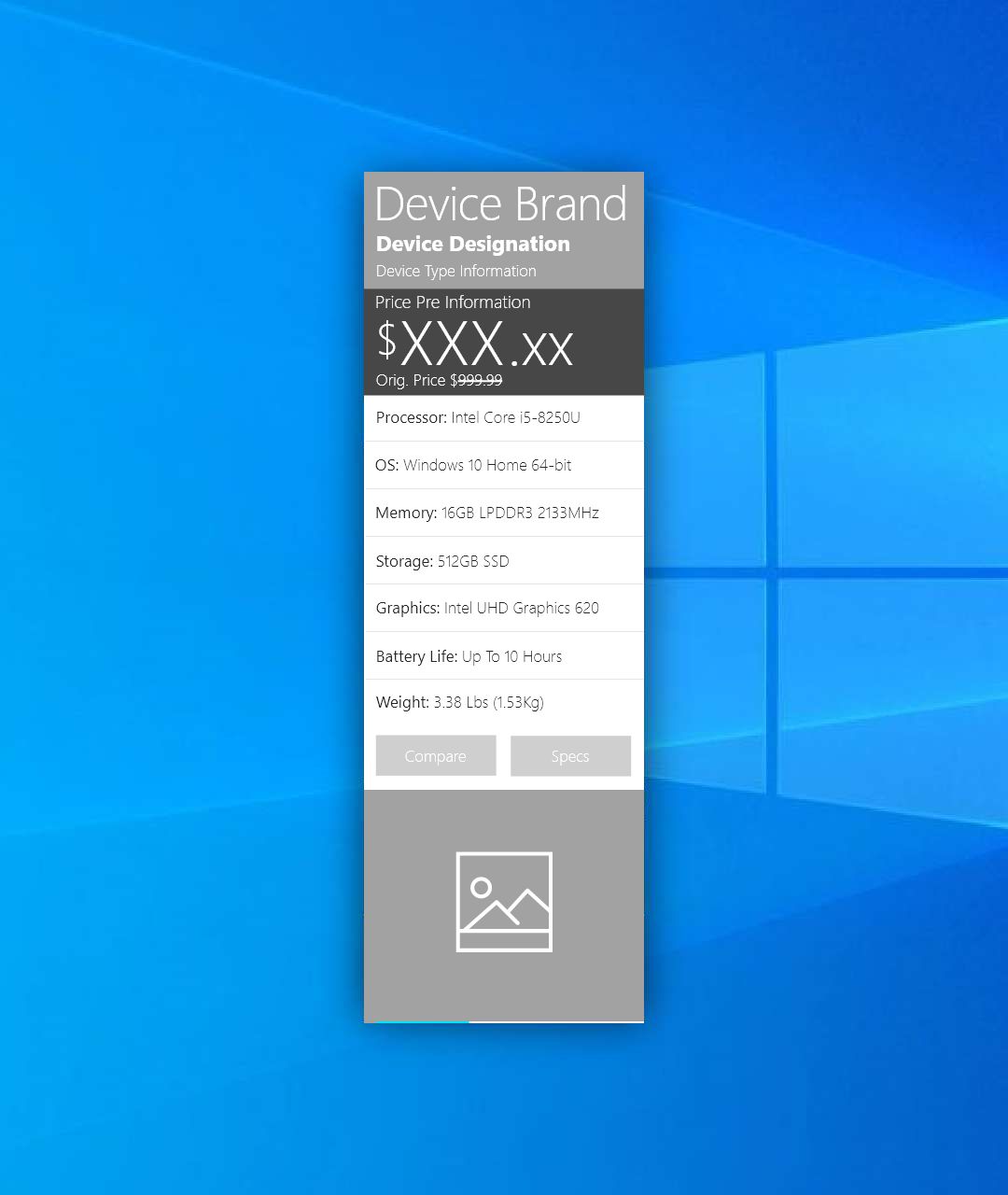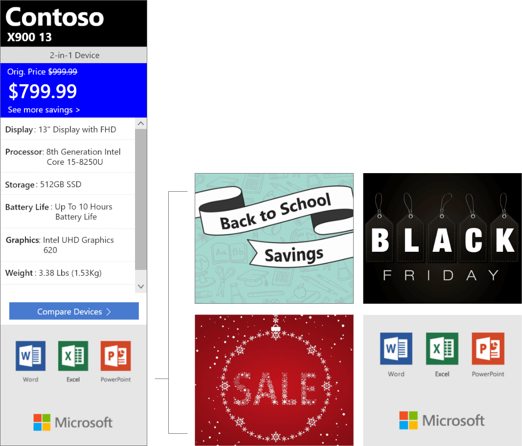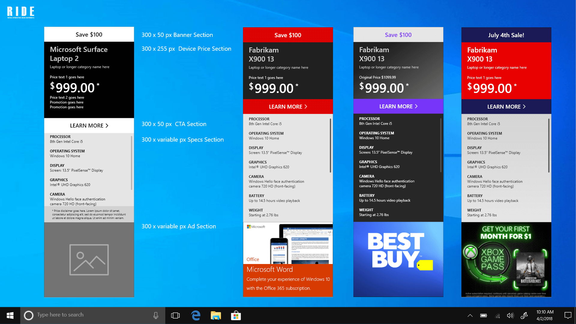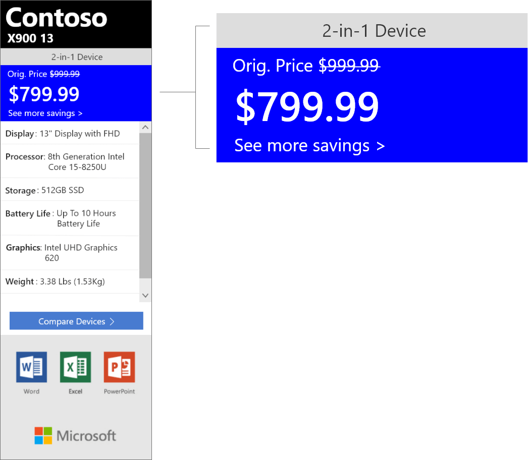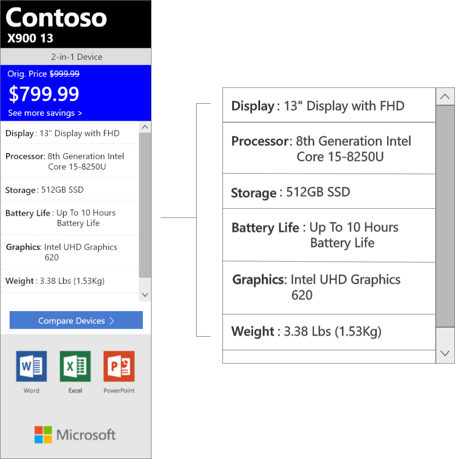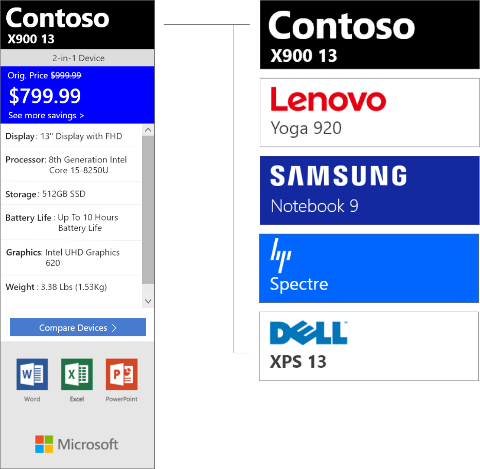 This is a brand new product to complement the existing Retail Demo Experience Platform (RDX), which showcases Windows at retailers worldwide. One of the most requested features of RDX was to know the pricing and specs of a given machine. Both retailers and end customer wanted something to make it easy to know specs, pricing and comparisons to different machines. In earlier versions of the software, a specs page was sometimes built out, but this was an option that was unable to scale, and with over 750,000 devices, wasn't feasible.