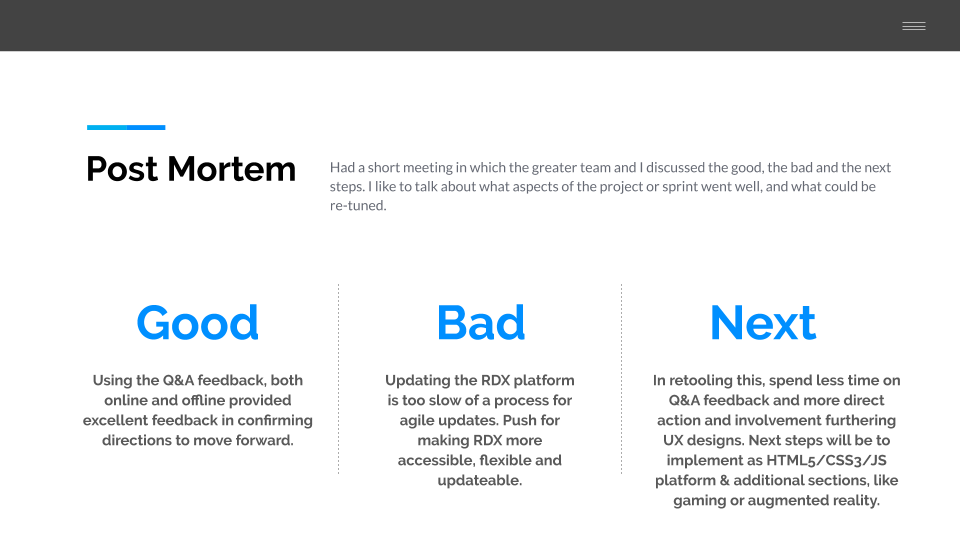 As the sole designer on the project, it was my pleasure to work with management, stakeholders and the dev team to bring this to light. Because the digital fact tag was designed as modular addition to the existing RDX technology stack, it was easy to integrate into the next build of RDX while still supporting the current framework. On the technology side, this was one of my major goals - to design this product in such a way that makes integration easy and straightforward. Providing solutions for developers, and stakeholders ensures we're all on the same side as we give these solutions to customers, whether retail giants or everyday people upgrading their machines.